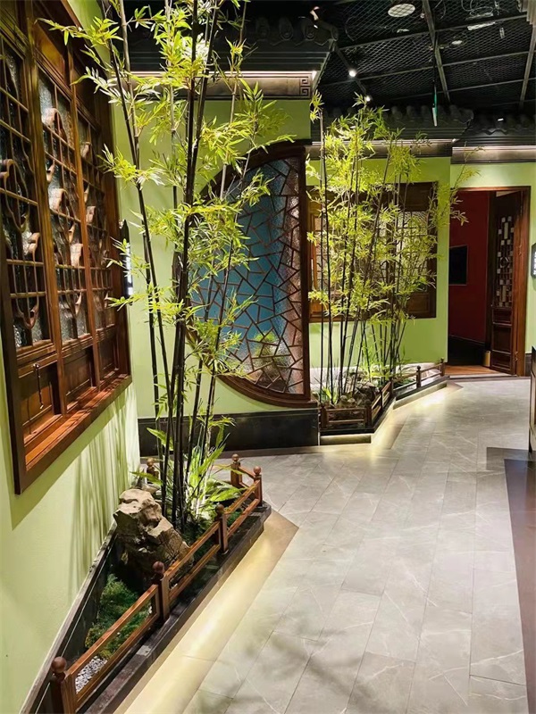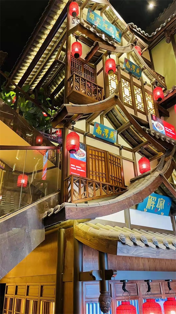 这个店的设计突破原有传统建筑的空间秩序,强调“街、巷、廊、亭、院”,整店设计有6个院落,32个包间,踏着青石路,曲径通幽处,院落的朱檐青瓦,明档菜品的琳琅满目,塑造着一个“出则繁华似锦,入则宁静致远”的小隐空间,为顾客提供安静、舒适的就餐环境。